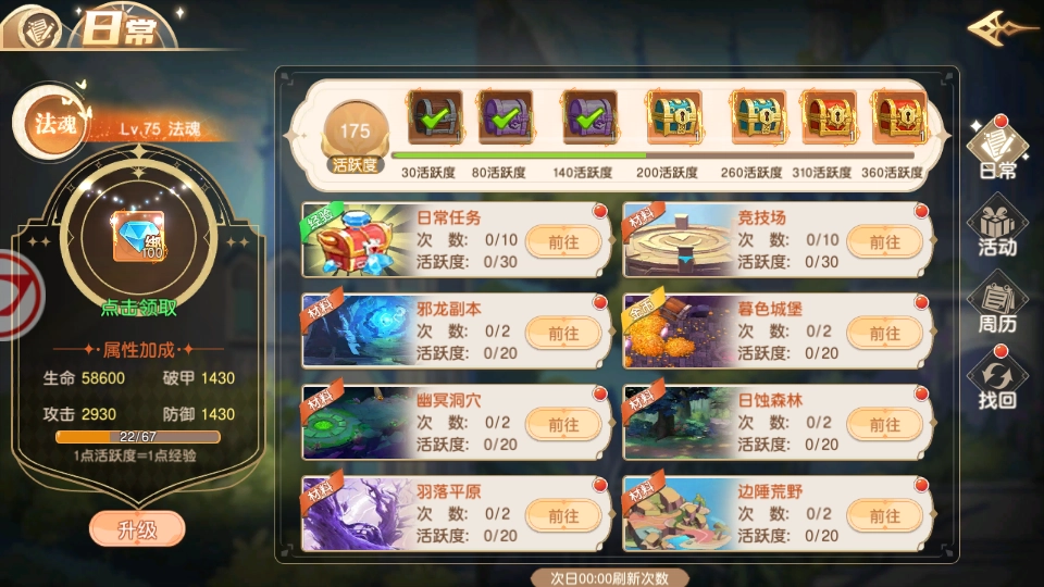 完成每日的日常任务能够获取丰厚奖励,积攒活跃度还能解锁各类不同的奖励。你可以打开“日常”界面,在任务界面的下方查看当日的活跃度数值,需要注意的是,活跃度会在每天凌晨0点准时刷新。
