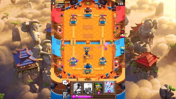 4、在部落冲突皇室战争无敌版的对战过程中,玩家需要拖动卡牌,通过消耗圣水把卡牌召唤到阵地上来开展战斗。游戏前期只能在己方的阵地上召唤卡牌,要是推掉了敌人两翼的公主塔,就能扩大召唤范围。