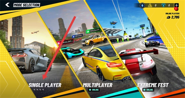 2、进入模式选择页面后,点击“SINGLE PLAYER”选项,选定单人竞速模式,随即进入赛道匹配环节。
