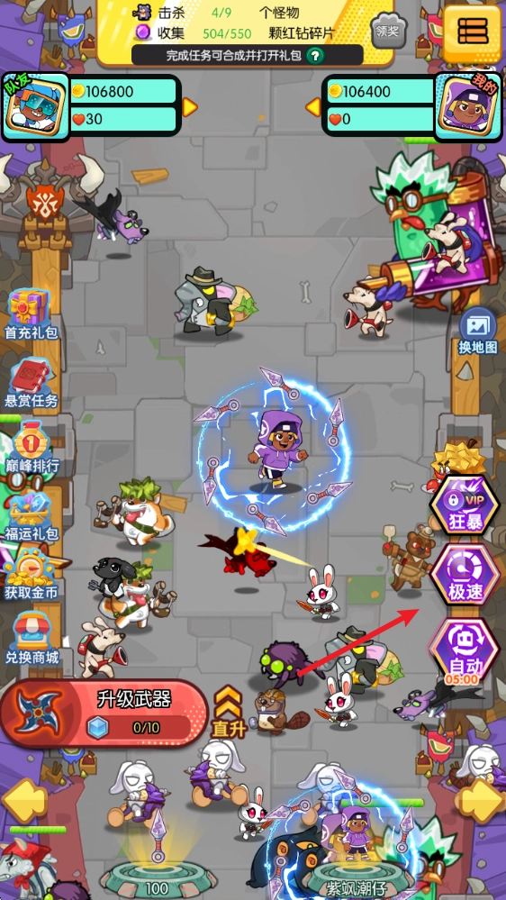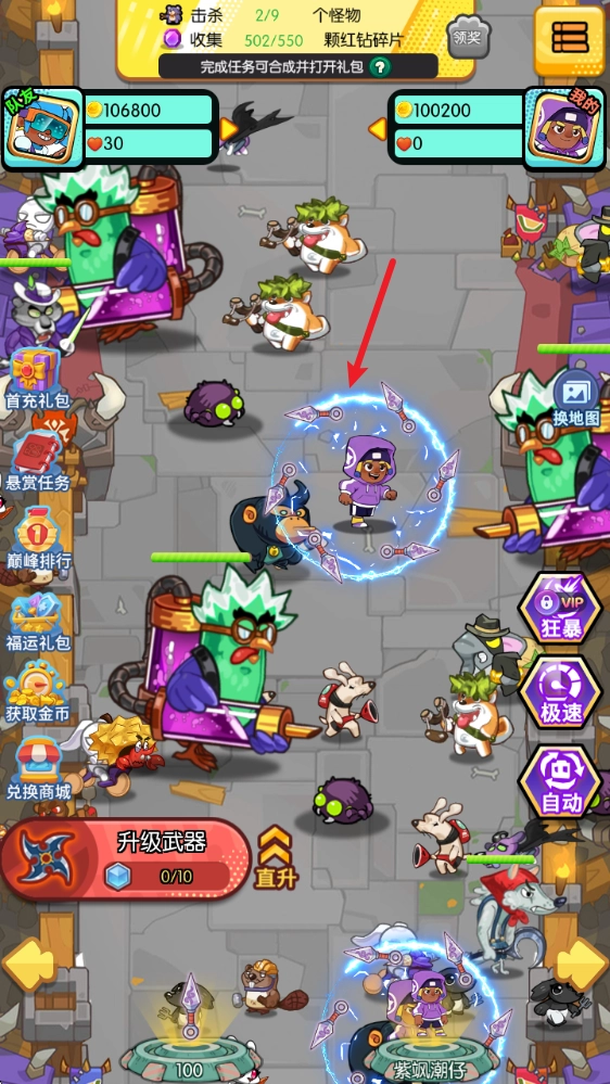 1、游戏中拖动屏幕即可控制自己的角色移动,攻击周围的敌人。