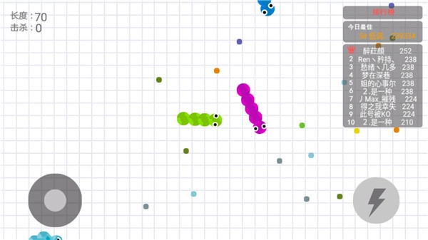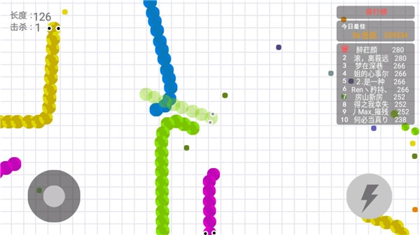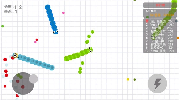 当游戏里出现闪电样式的按键时,长按它就能让你的蛇获得加速效果。这时候需要灵活调整移动方向,引诱其他玩家的蛇主动撞到你的蛇身上,这样就能成功将对方的蛇吞噬掉。
