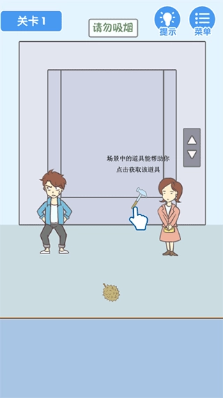 在教学引导的环节里,先点击获取工具锤子,接着用拖拽的方式操控锤子去砸开榴莲,利用这个动作吓跑在场的人,之后再点击画面中的男性角色。