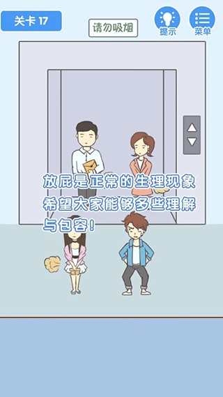 借助各式各样的道具达成任务,悄悄放屁且不被他人察觉,以此通过关卡。