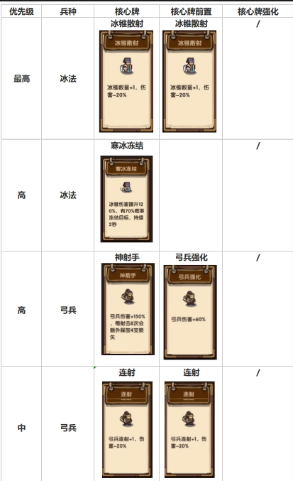 优先以铺满兵种为首要目标,兵种选择优先级为冰法师>弓兵>枪兵>风法;后续在选择核心牌时,可参考以下推荐顺序。