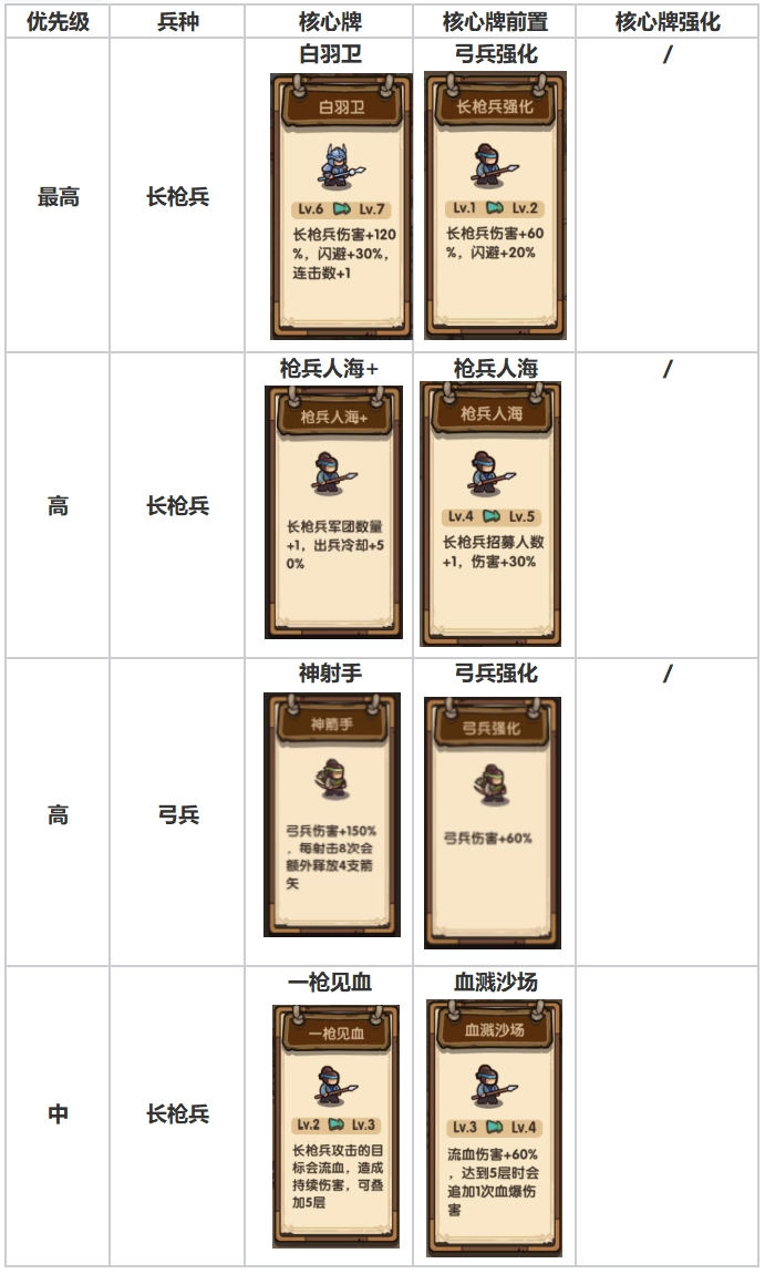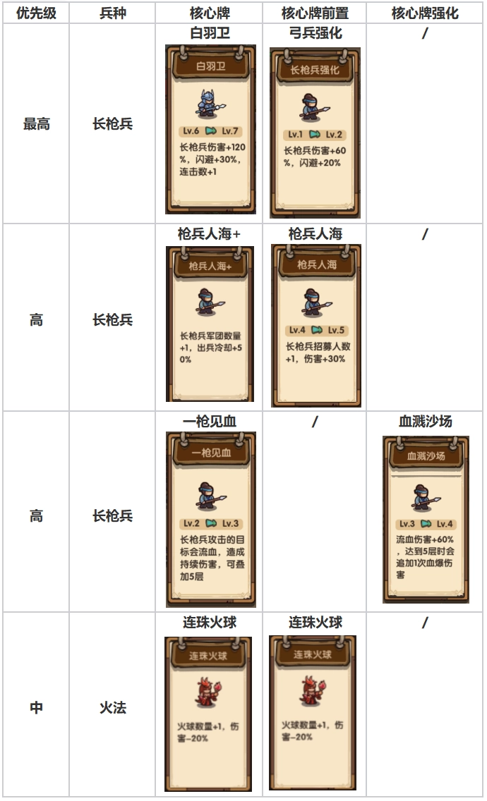 优先把兵种铺满,优先级为弓兵>火法师>刀盾>其他,后续核心牌的选择顺序推荐如下