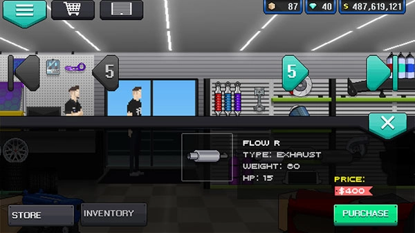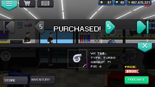 游戏为玩家准备了数十款风格各异的像素赛车,可供收集与升级;每一辆赛车都具备独特的操控手感与性能指标。
