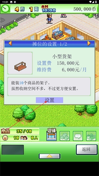 选择摊位的建造设置时,可挑选小型货架或自动贩卖机,点击下方的设置按钮即可完成安装。