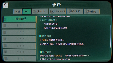 选中资料栏既能收集你获取的信息,又可查看玩法教学,有助于你理解游戏机制。