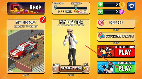 进入游戏界面后,点击绿色的【PLAY】按钮,先熟悉【Different-Man】角色,以及【SHOP】【MY-HIDEOUT】等功能模块,随后开启战斗冒险之旅。
