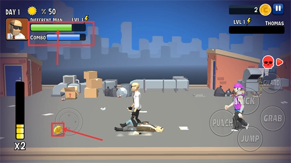 战斗时要留意【Different-Man】的血量与【COMBO】条,还要收集金币,积累资源为后续提升做准备。