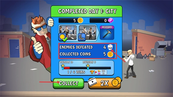 完成【Day-1-City】关卡后,击败4个敌人并收集5枚金币,点击【COLLECT】按钮领取奖励,以此为后续战斗积累资源。