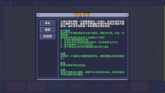 3、通过帮助系统学习建筑管理、居民分配与科技研发规则。