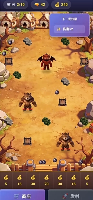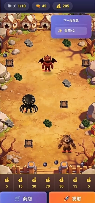 4、通过闯过关卡来获取金币资源,接着在商店里购买弹药补给,解锁新型的魔兽炮弹以及弹射器的升级组件,以此不断提升自身的战斗能力。