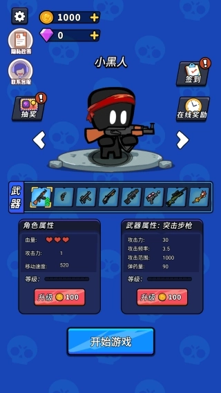 2.战前强化准备:消耗金币可提升角色基础属性与武器威力,点击“开始挑战”即可进入战场