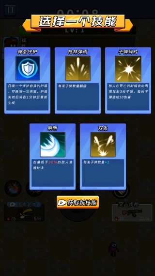 2.动态增益选择机制:玩家通过击杀怪物获取经验值,当等级提升时,系统会随机生成三项增益选项,玩家需从中挑选一项来进行自身能力的强化。