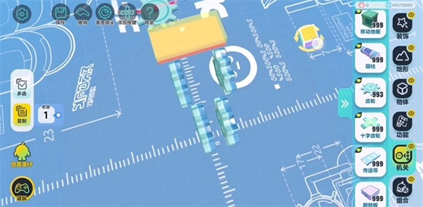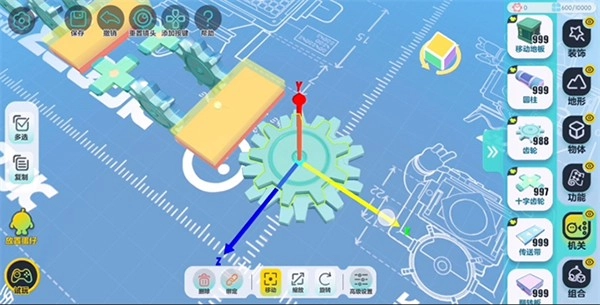 为了操作更便捷,在正式开始搭建之前,需要先把设置里的编辑视角调整为【上帝视角】。从机关选项中找到“齿轮”并拖拽出来,就能完成“齿轮”摆放的基础操作。除了常规的摆放方式外,还可以点击【旋转】按钮让“齿轮”竖起来,也能通过调整【缩放】参数来改变“齿轮”的大小以及侧面的宽度。