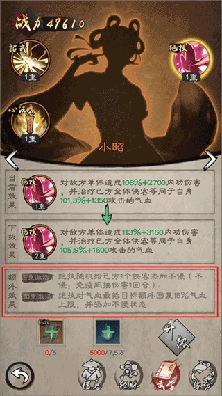 招式与心法升级后,可提升对应技能的伤害或增减益的数值效果;绝技升级至特定重数时,会激活其增强效果。