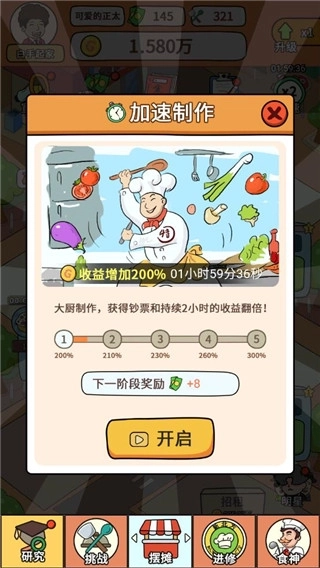 3、解锁完三个摊位后,还能借助加速制作的方式提高工作效率,从而赚取更多收益去解锁更多摊位