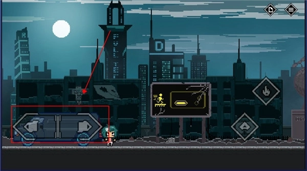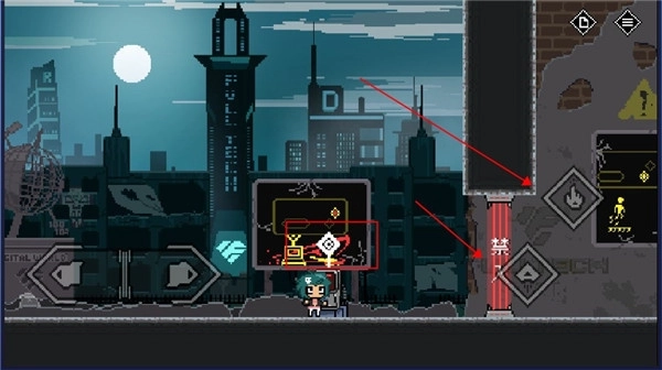 5、碰到禁止通行的大门时,不能直接上前,得先找到开关并点击攻击;而这扇门则需要走到红框标注的位置,同时按下跳跃键和攻击键才能打开。