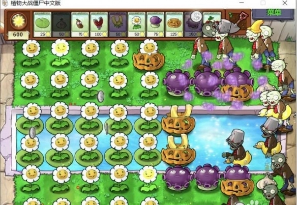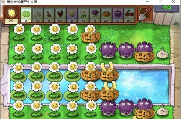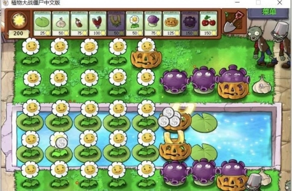 2、开局阵容,如下图。留两百个阳光,以免蒜头或者南瓜头被吃掉。