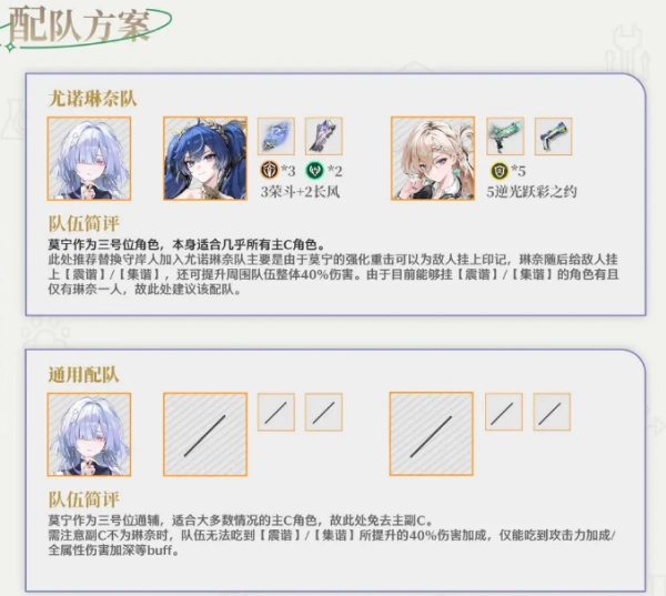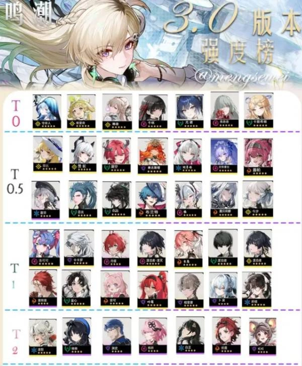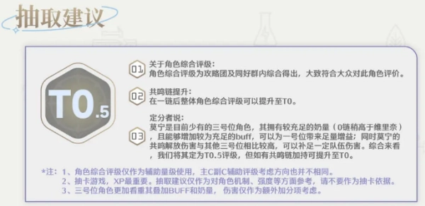 莫宁作为目前稀缺的三号位角色,拥有充足的治疗量(0链时略高于维里奈),并能提供显著的增益效果,为一号位角色带来足量加成。同时,其共鸣解放伤害也相对较高,可弥补队伍伤害。综合考量,我们将其定为t0.5评级,但若有共鸣链支持,可提升至t0级别。