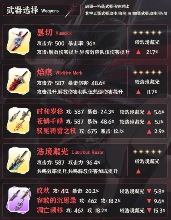 4、千咲的首选武器为专武昙切。除此之外,露帕、奥古斯塔、今汐、忌炎的专武也可提供增伤效果。常驻五星长刃的优势相对较低。若希望提升队伍整体实力,则专武昙切为必备之选。