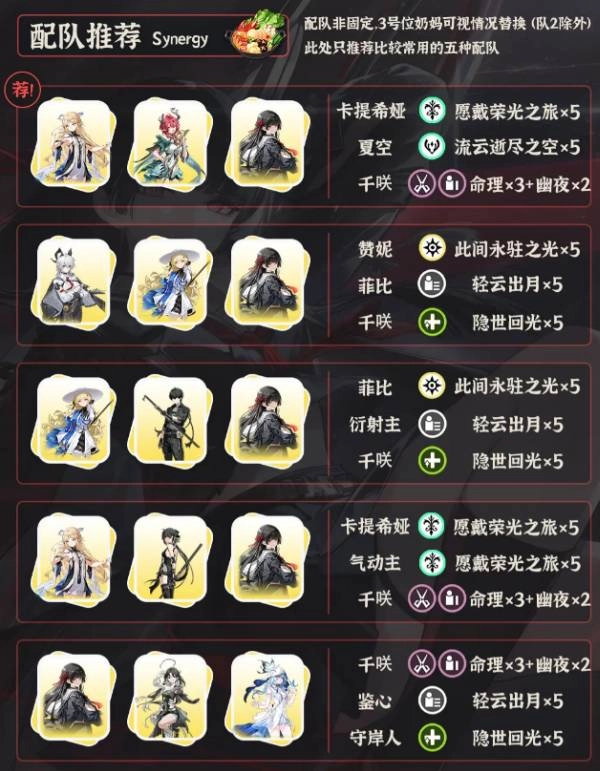 5、千咲主要加入异常效应队伍担任辅助增伤角色。当前效应队伍中有卡夏和赞菲等选项,其中卡夏为最佳配队选择。千咲可额外增加异常效应层数上限并提供治疗支持,完全替代气动主角色,并凭借高额的效应队增伤效果进一步强化卡夏队伍。赞妮因无法自行施加异常效应而无法享受千咲专武效果。未来版本中,千咲将随着新效应队伍的加入而拥有更广泛的就业空间。若当前希望将千咲作为主c使用,可考虑搭配一些共鸣解放增伤的副c角色如鉴心、吟霖、长离等。若手中没有守岸人角色,则可将千咲暂时安排至大部分队伍中担任减防奶妈角色。