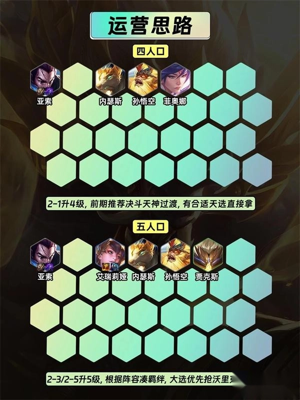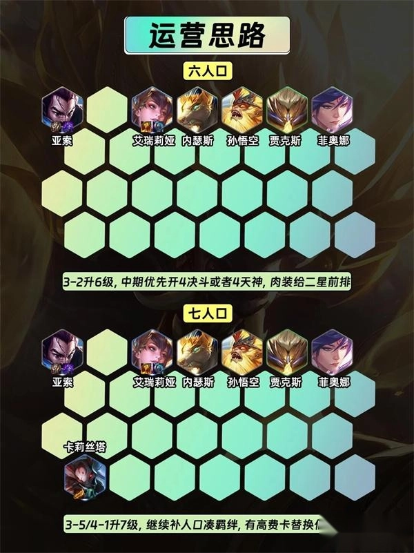 3-5/4-1到4-1阶段升至7级,接着补充人口以凑齐羁绊,若有高费卡牌就替换掉低费卡牌。