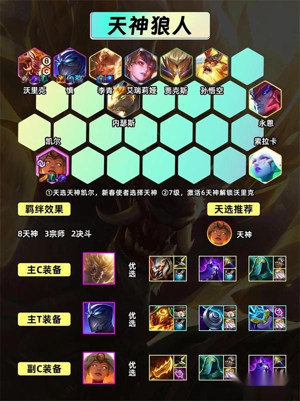4-1/4-2到4-2阶段升8级,先卖掉低费天选,然后用大量金币D牌寻找凯尔和基础阵容来开出6天神羁绊,等沃里克解锁后就安排他上场,之后在8级阶段把阵容里的所有英雄都升到二星。