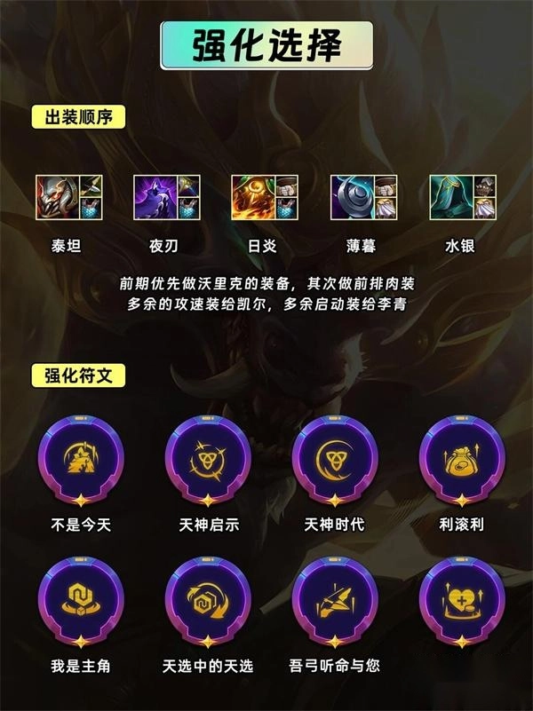 前期优先为沃里克配备装备,其次打造前排肉装,多余的攻速装备分配给凯尔,多余的启动装备则交给李青。