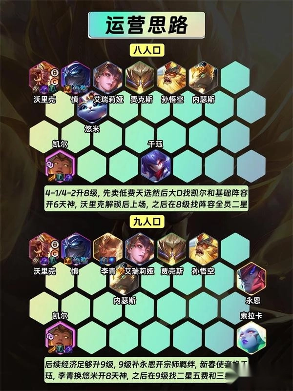 后续经济充足时升9级,9级补上永恩以激活宗师羁绊;将新春使者替换为千珏,李青换成悠米,从而开启8天神羁绊;之后在9级阶段寻找二星五费英雄和三星四费英雄。