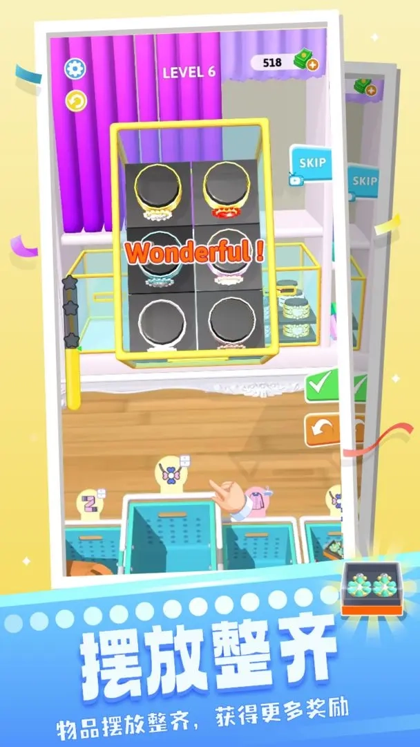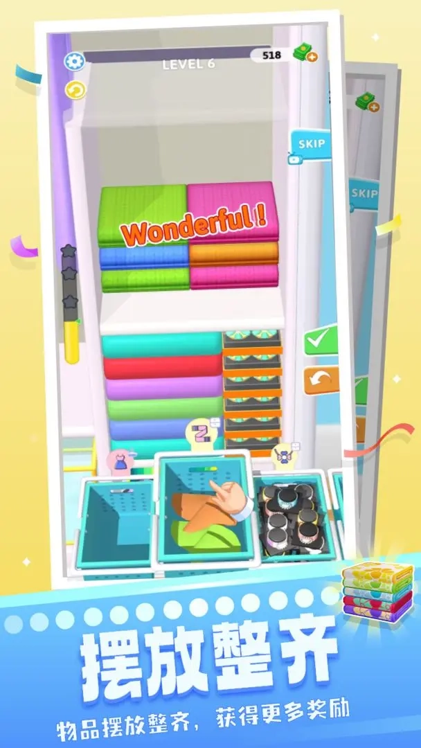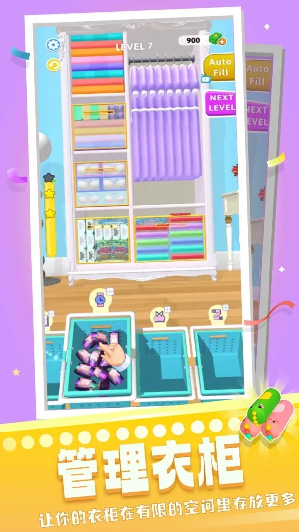 这是一款以收纳整理衣柜为主题背景的休闲手机游戏。游戏美术风格采用3D立体造型,色彩运用上着重体现优雅与平和之感,各类道具的造型细节也十分丰富。 2. 在游戏里,玩家将化身为经验丰富的整理专家,需要对自己的衣物、鞋履、帽子以及各类配饰进行整理,并把它们收纳到橱柜之中。过程中你会碰到各式各样待收纳的衣物,如何高效利用有限的空间,将这些物品排列得井然有序、整洁干净,将是你面临的最大挑战。