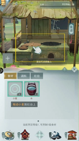 把食材拖到灶台上面,滑动来点燃柴火,多滑动几次就能做好美食啦。