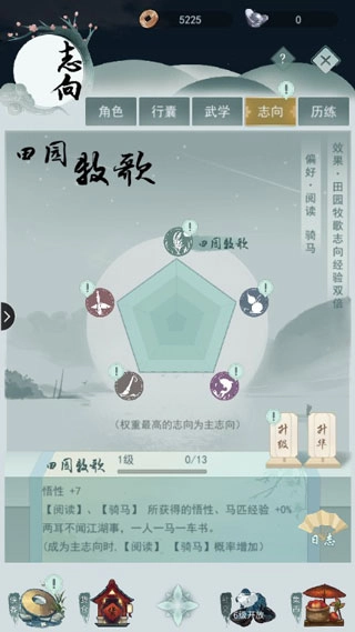 权重最高的志向即为主要志向,在庭院场景中会更偏向于采取行动,而通过这些行为所获取的经验值将会翻倍。