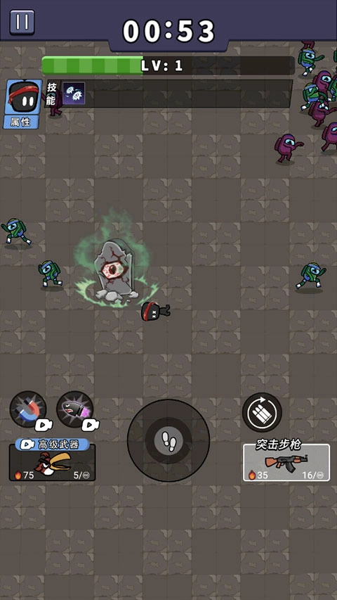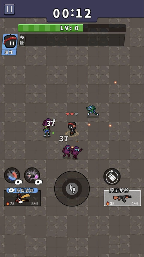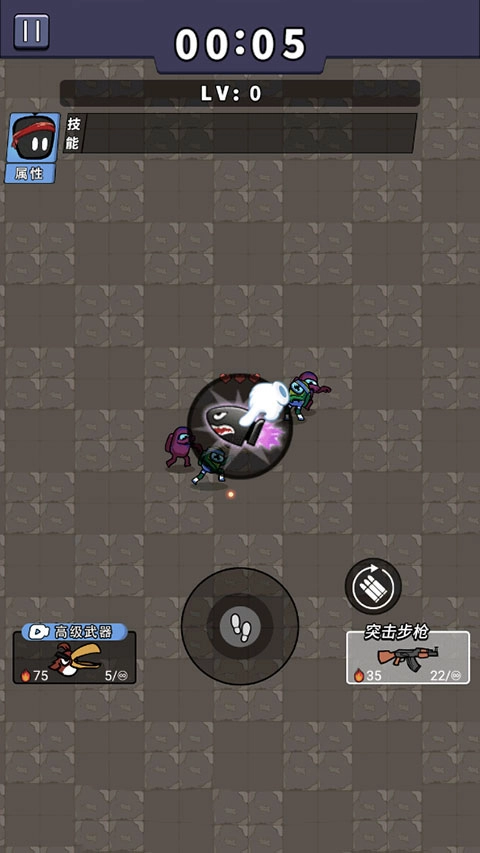 3、滑动中心按钮躲避敌人的攻击,与他们保持一定的距离,英雄自动射击、自动刷新子弹