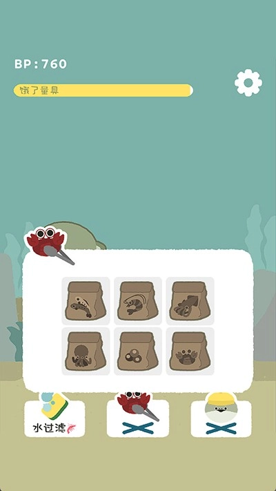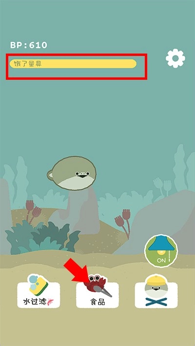 2、孵化完成后,你可以开始为你的萨卡班甲鱼提供食物了。注意观察屏幕上方的黄色饥饿进度条,点击下方的食物图标即可进入投食界面。
