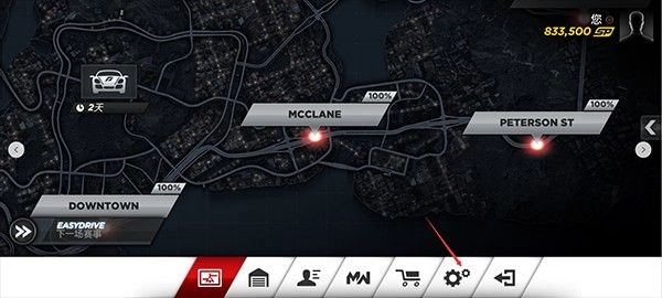 1、安装极品飞车17最高通缉最新版本,进入到游戏主页面点击如图所示的齿轮按钮;