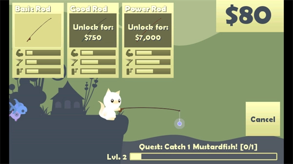 小猫钓鱼,Cat Goes Fishing,是一款卡通风格的休闲钓鱼游戏。玩家能操控一只超萌的小猫咪尽情钓鱼,整个过程操作简单,只需把鱼竿抛出去,稍作等待就能钓上鱼,进而获得不错的金币奖励,这些金币可用于购置更高级的鱼竿和鱼饵。