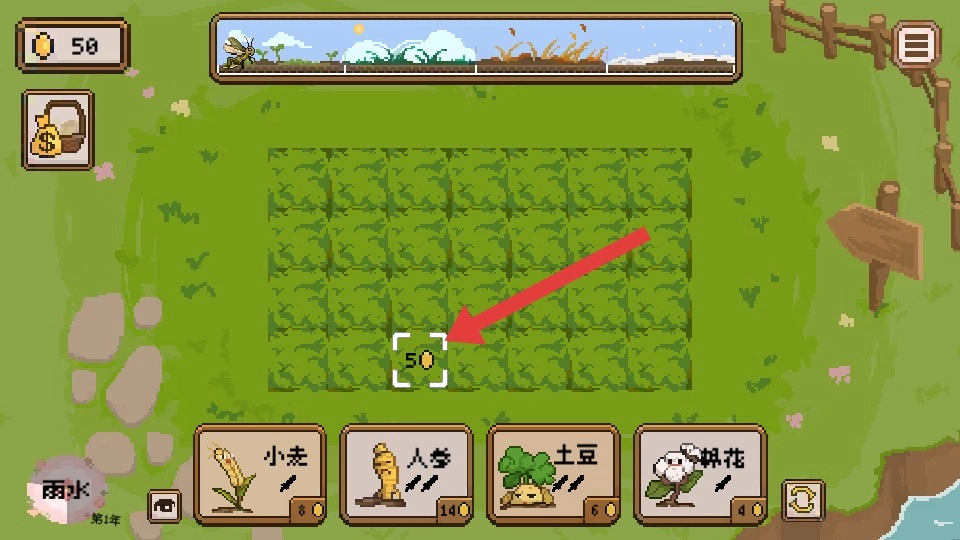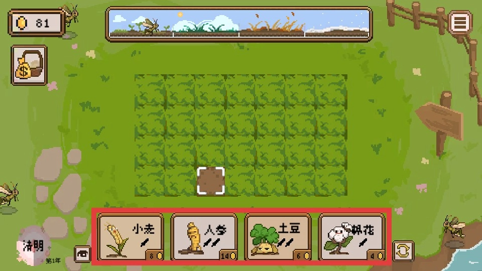 查看下方红框内的【小麦】【人参】【土豆】【棉花】等作物,挑选你想要种植的作物来进行播种。
