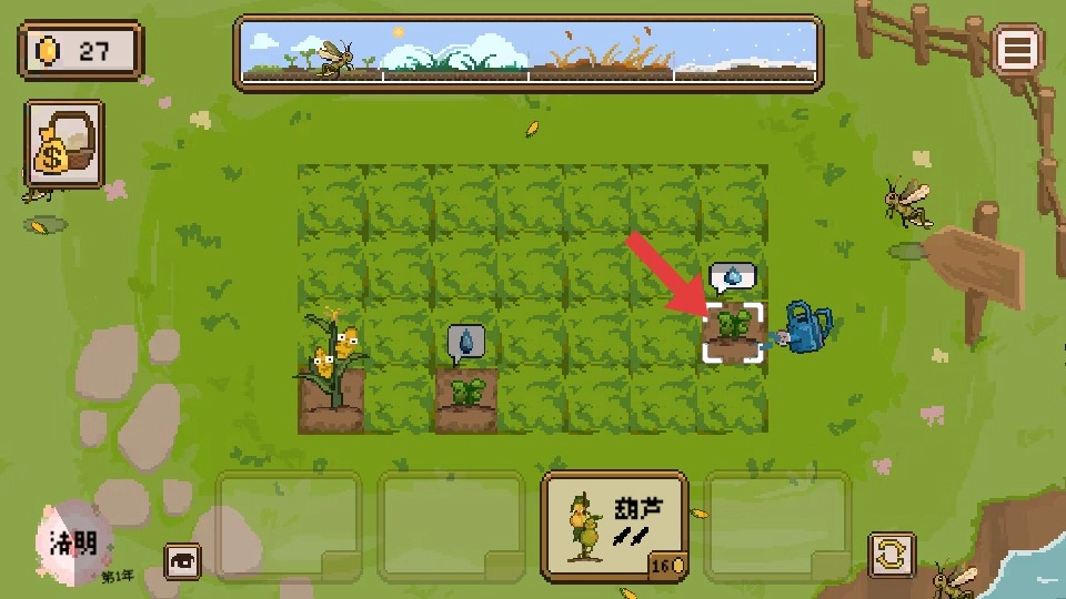 种植完成后,留意作物的生长状态,长按箭头指示的位置,为作物浇水以进行养护。