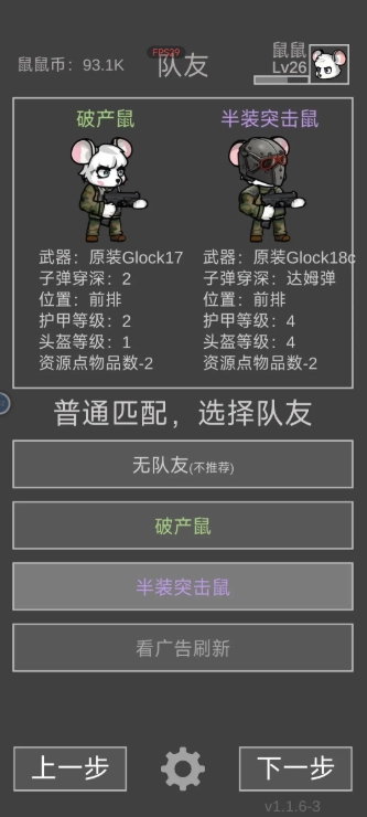 队友选择我们的前排突击鼠时,最好选紫色品质以上的。要是没找到满意的队友鼠,可以先退回到选择难度的界面,再重新进入,这样就能不看广告刷新队友鼠了,不过要是你的招募处等级不够高,这样基本刷不出高级队友。