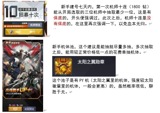 机动战队经过多次更新后,出现了一些主要变动:首先是可选机师数量有所减少,当前仅剩下20个机师(因此部分攻略会建议优先选择琳德或伍德这类机师,但现版本的初始机师列表里并不包含琳德和伍德),玩家需要从中挑选3个机师;其次是在后续的首次机师招募十连抽中,必定能获得其中一位机师,不过要注意的是,机师十连抽本身没有保底机制,只有在七天内进行的第一次十连抽才享有保底福利。