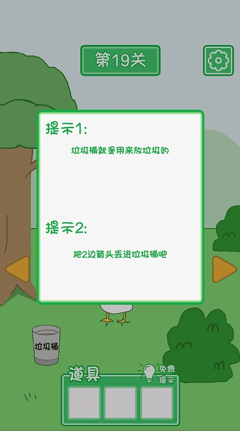 在第19关,首先把向左和向右的箭头拖进垃圾桶,之后点击鸭子就能顺利通关了。