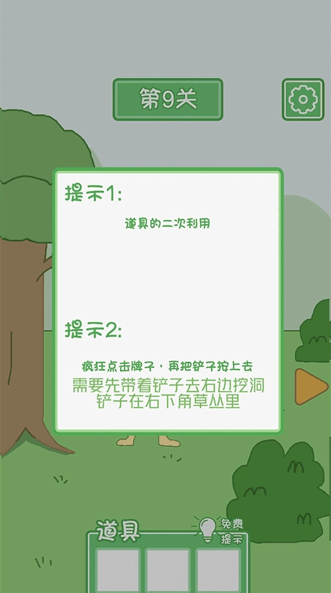 第2关的通关步骤是这样的:首先点击右下方的灌木丛,随后点击铲子。获取铲子后,把它拖到草地上的裂缝位置就能过关了。