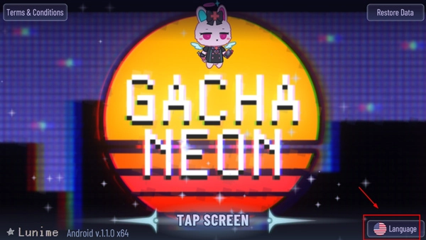 1、启动加查霓虹灯游戏,进入游戏后界面如图所示,找到右下角的Language按钮并点击;