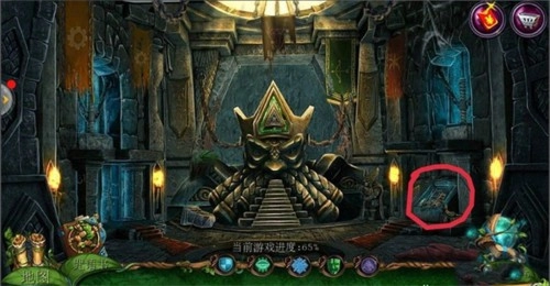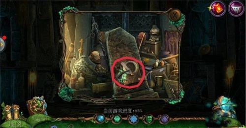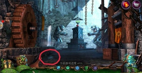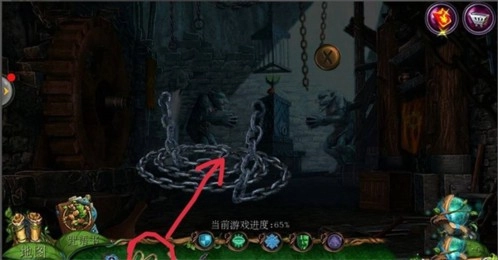 2、点击左侧场景里的【哥布林房间】,接着点击中间下方的齿轮;在齿轮附近获取【铁链】;使用【八边形钥匙】开启机关,随后在地面上拿到【镰刀】。