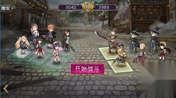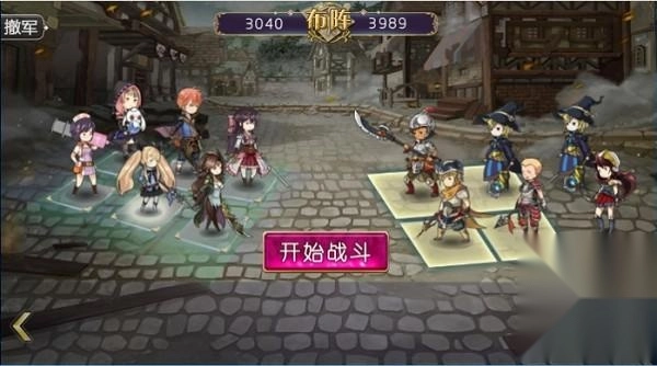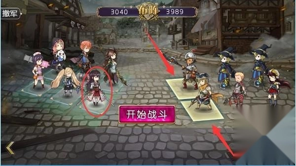 战斗刚开始时,我们可以先通过分析双方兵力来判断战力差距。上方布阵的左侧是我方兵力,总战力刚过3000;右侧敌方战力接近4000,双方相差约1000。这种情况下,就只能靠玩家的角色搭配来弥补战力差了。下面先讲讲站位问题: