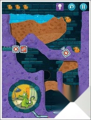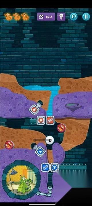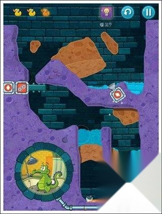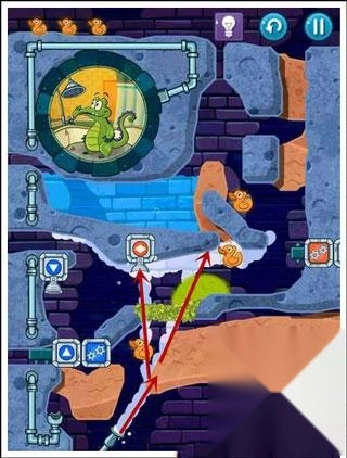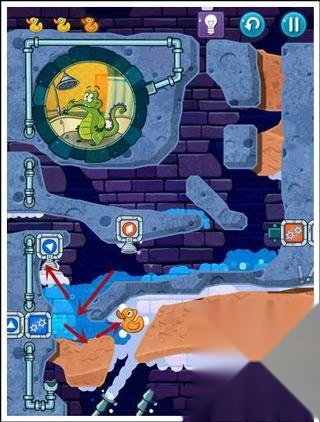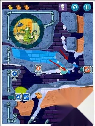 2、当红色开关和2只鸭子都激活后,先划开地图下方两个平行通道正上方的泥土,接着迅速划开带红色卡口的通道,就能顺势让水弹进入右侧通道。