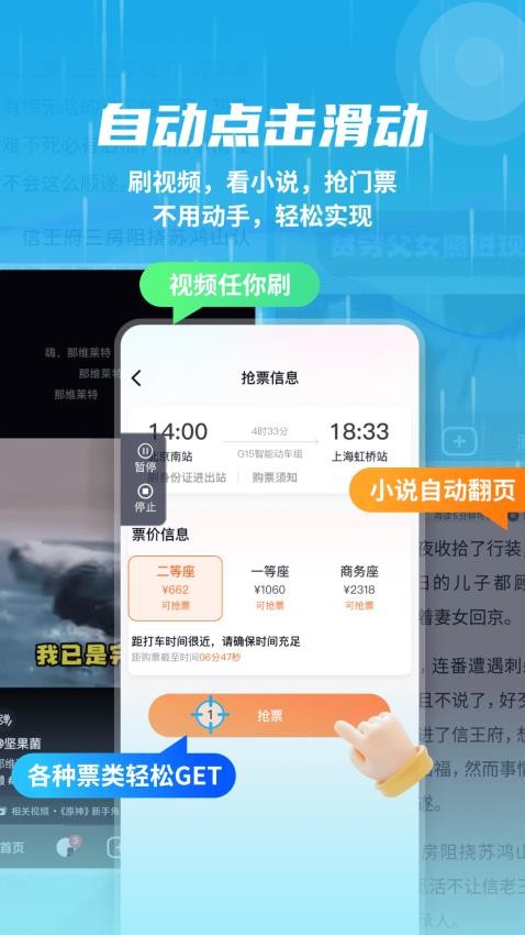 自动连点抢票触控神器app是一款拥有独特且实用的手机智能连点功能的应用软件,内含十分便捷简单的自动连点抢票模式设置。在此操作系统中的操作特别简便,可以协助用户设置并开启多种连点器模式,包括自动翻页、自动抢票、游戏托管和文件批量处理等;该软件的手机版在自动连点抢票时表现流畅迅速,无任何广告和卡顿问题;此款应用由成都吉祥止止网络科技有限公司专为用户开发,提供全新的手机自动连点辅助工具。对此软件感兴趣的朋友们可千万不要错过,赶紧来本站下载体验吧。