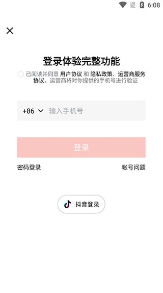 1、登录体验覆盖完整功能,支持手机号登录与抖音号登录;